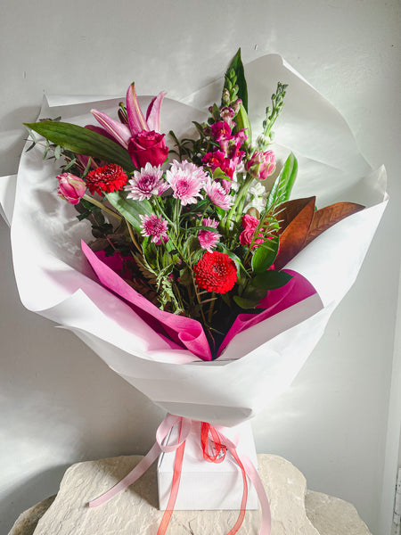 This bunch of velvet roses, lilies, dahlias, hydrangea and more are hand picked to make the most extravagant bouquet. Make that someone special's day and order this now.